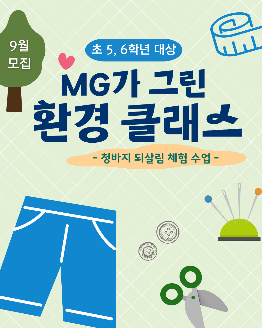 초등학교 대상 청바지 업사이클 무료 체험 교육 2025 MG가 그린 환경 클래스 신청 오픈했습니다 초등학생을 위한 재미있고 의미있는친환경 체험 교육 찾고 계신가요?버려질뻔한 청바지를 기부 받아서나만의 업사이클 필통으로 완성하는무료 체험 클래스2025 MG가 그린 환경 클래스가 2024년에 이어 2025년에도 진행됩니다 ▶ 대상: 전국 초등학교 5~6학년▶ 신청 : 초등학교 5~6학년 담임 선생님이 신청▶ 인원: 학교당 5,6학년 중 최소 1 학급, 최대 2 학급 가능(선생님 1분이 2개 학급 신청 가능)▶ 수업 시수: 학급당 2교시▶ 수업 시기: 25년 9월~ 11월 (현재 1차 9월 신청 페이지만 오픈)▶ 1차 (9월) 수업 신청 기간: ~8/27(수) 23시 30분까지 MG가 그린 환경 클래스 란? MG새마을금고중앙회가미래 세대인 초등학생 아이들에게친환경 감수성을 키우고 자원 순환의 중요성을직접 체험을 통해 느끼도록 하기 위해서 진행하는초등 대상 청바지 업사이클 체험 클래스 입니다※ 2024년에 이어 2025년에도 지구랭스쿨이 함께합니다 2025 MG가 그린 환경 클래스에선정된 학급에는교구비 무료! 강의비 무료! (꺄오!)환경에 대한 이야기,의류 쓰레기 문제와 자원 되살림에 대한알차고 재미있는 이론 수업과 함께내 손으로 직접 완성하는청바지 업사이클 체험 수업이진행되는 수업을경험해 볼 수 있어요 << 2024년 먼저 만나본 학생들의 수업 평가 >> 수업만족도 4.8점 / 5점 만점 MG가 그린 환경 클래스는참여하는 학생들의 만족도 평가가말해주듯이학생들이 정말 좋아하는 수업입니다신선하고 뜻 깊은 경험 27.7%재미있고 가치있는 수업 24.6% 재미와 의미두 마리 토끼를 다 잡은 수업아이들이 수업 평가에남겨준 글 하나 하나가감사할 따름이에요^^ MG가 그린 환경 클래스 9월 수업 지금 신청받고 있습니다초등 5학년, 6학년 선생님이시라면!지금 바로 신청해보세요 [ 9월 수업 신청 방법 (2가지 방법 중 선택) ]① 지구랭 인스타그램 (https://www.instagram.com/jigoorang) "프로필 링크"에서 신청② 신청 링크로 직접 신청 : 9월 신청 페이지로 이동하기 (클릭) : https://naver.me/GlGjAXmv 지구랭 인스타그램(@jigoorang) 팔로우하시면9월 수업 신청 이외에도10월, 11월 수업 신청이 시작되면인스타그램을 통해바로 안내받으실 수 있습니다 9월부터 11월까지 학교에서 만나용!!!